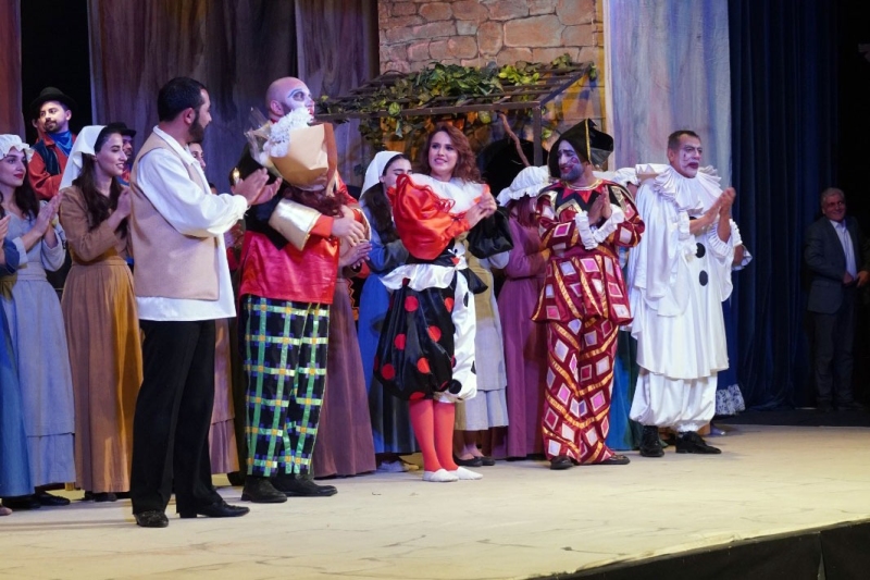 Главные партии исполнили: Адиль Ахундов (Канио), Фатима Джафарзаде (Недда), заслуженный артист Антон Ферштандт (Тонио), Рза Хосровзаде (Сильвио) и Фахмин Ахмедли (Беппо). Также в спектакле заняты заслуженные артисты Турал Агасиев и Халид Дашдемир.