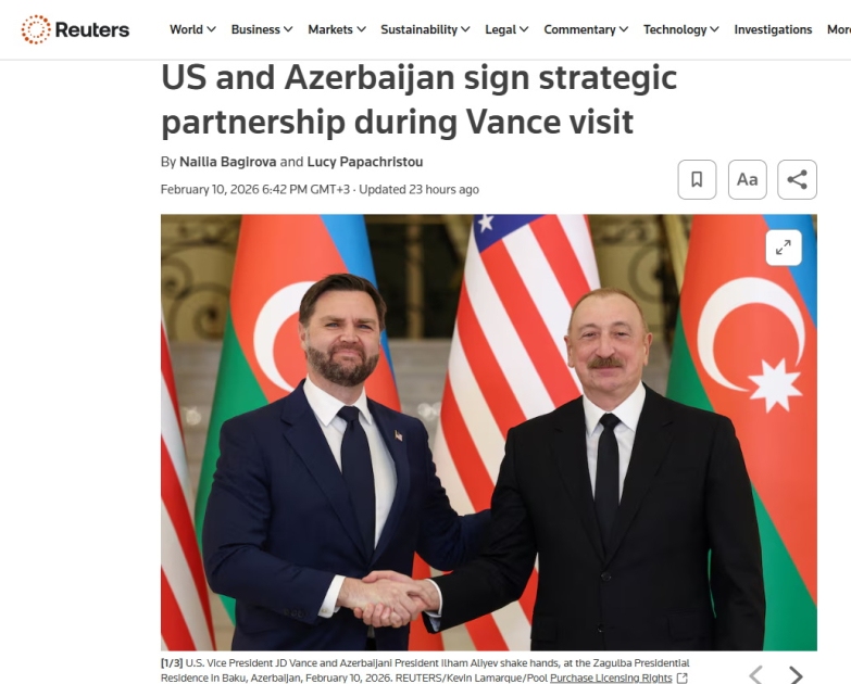 В опубликованной агентством Reuters статье под заголовком «США и Азербайджан подписали соглашение о стратегическом партнерстве в ходе визита Вэнса» сообщается, что Президент Азербайджана Ильхам Алиев в ходе совместного заявления для прессы заявил о вступлении отношений между США и Азербайджаном в совершенно новый этап. Согласно публикации, Вэнс сообщил, что США направят суда для обеспечения охраны территориальных вод Азербайджана. Подчеркивается, что Хартия впервые была представлена в августе в Вашингтоне в ходе переговоров между Президентом Ильхамом Алиевым и Президентом Дональдом Трампом.