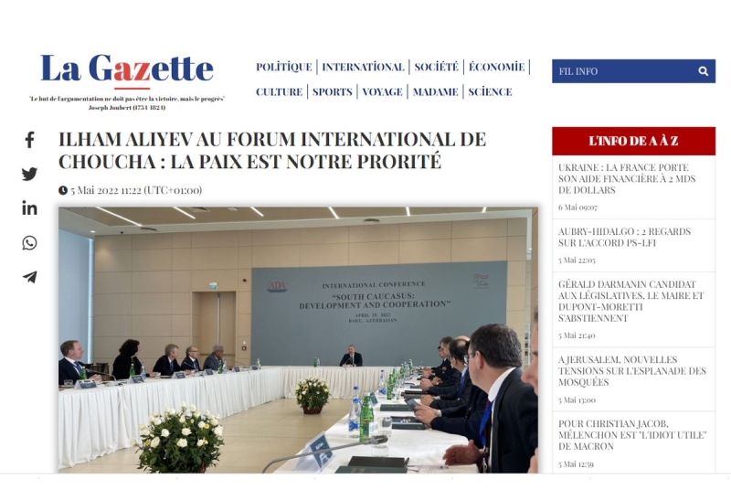 Парижская онлайн-газета Lagazetteaz.fr опубликовала статью, посвященную международной конференции "Южный Кавказ: развитие и сотрудничество", состоявшейся 28 апреля в Шуше.