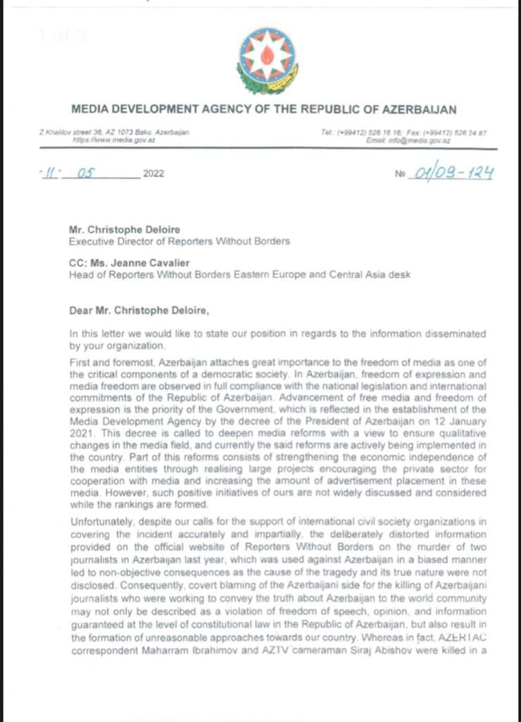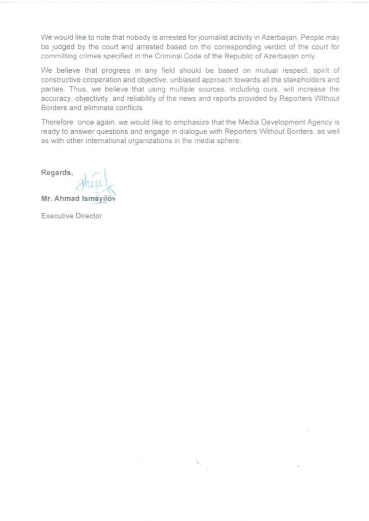 В письме подчеркивается, что Агентство развития медиа Азербайджана готово к диалогу с организацией «Репортеры без границ», а также с другими международными организациями, работающими в сфере медиа.