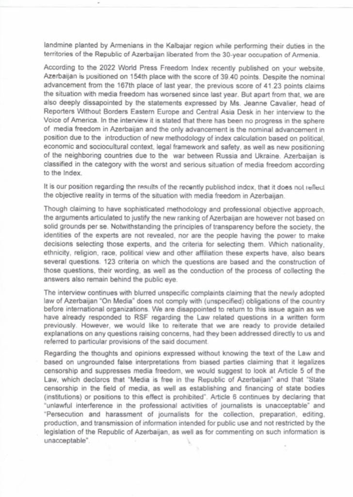 В послании подчеркивается, что сайт организации «Репортеры без границ» в 2021 году опубликовал в искаженной форме информацию о журналистах, погибших при исполнении служебных обязанностей в результате взрыва установленной армянами мины в Кяльбаджарском районе, не раскрыл настоящую причину и суть трагедии, создав предпосылки для использования этой информации против Азербайджана, что привело к формированию необоснованных подходов.