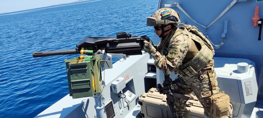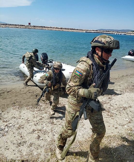 Как сообщили в Минобороны Азербайджана, в очередной день учений в соответствии со сценарием были успешно выполнены задачи по очистке береговой линии от мин, проникновению по воздуху в тыл условного противника, нападению на его прибрежный военный объект и обезвреживанию обнаруженных террористов.