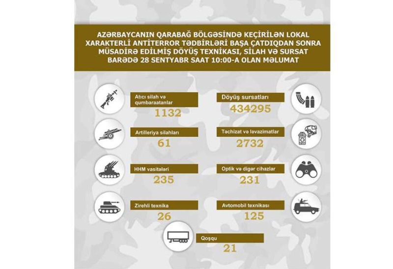 БАКУ/Trend/ - Министерство обороны Азербайджанской Республики обнародовало список боевой техники, оружия и боеприпасов, конфискованных после завершения локальных антитеррористических мероприятий в Карабахском регионе Азербайджана, по состоянию на 10:00 28 сентября, сообщает в четверг Trend.