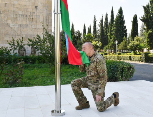 Президент Азербайджана Ильхам Алиев в воскресенье поднял Государственный флаг Азербайджанской Республики в городе Ханкенди (Карабахский регион страны).
