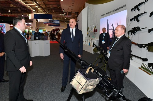 Министр оборонной промышленности Вугар Мустафаев проинформировал главу государства о том, что на выставке представлены различные виды стрелкового оружия, средства ближнего боя, минометы, боеприпасы различного калибра, беспилотники и т.д., в общей сложности 88 наименований продукции оборонного назначения, производимой предприятиями ведомства.