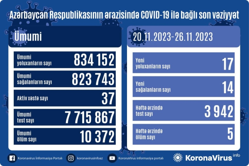 Как сообщили Trend в понедельник в Оперативном штабе при Кабинете министров, за последнюю неделю зафиксировано 17 новых случаев заражения.