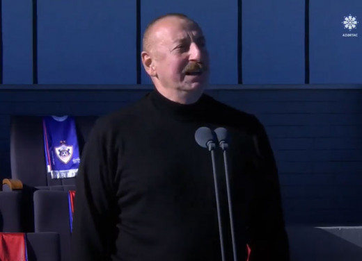 Алиев выступил на открытии игры и поздравил всех присутствующих с тем, что это первый футбольный матч после освобождения Ханкенди.