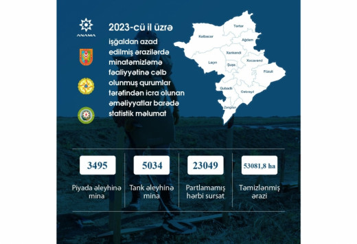 Как сообщает ANAMA, на освобожденных территориях в минувшем году было найдено и обезврежено 3495 противопехотных мин, 5034 – противотанковых мин, 23049 неразорвавшихся снарядов.