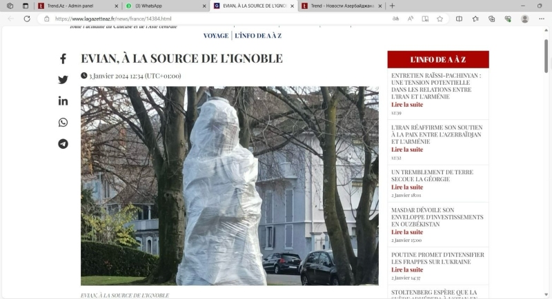 "В поддержку армянских сепаратистов город Эвиан-ле-Бен хочет снести памятник поэтессе Натаван. Спустя почти 30 лет азербайджанцы восстановили территориальную целостность своей страны. Территориальную целостность, признанную ООН четырежды подряд. Азербайджан и Армения теперь признают суверенитет друг друга, и сейчас вступили в фазу восстановления мира", - говорится в статье.