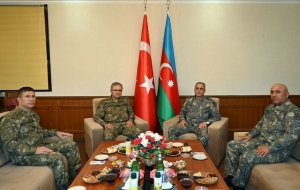 БАКУ /Trend/ - Заместитель министра обороны Азербайджанской Республики — командующий Сухопутными войсками генерал-полковник Хикмет Мирзоев встретился с находящейся с визитом в нашей стране делегацией во главе с командующим 1-й армией Сухопутных войск Турецкой Республики генералом армии Метином Токелем.