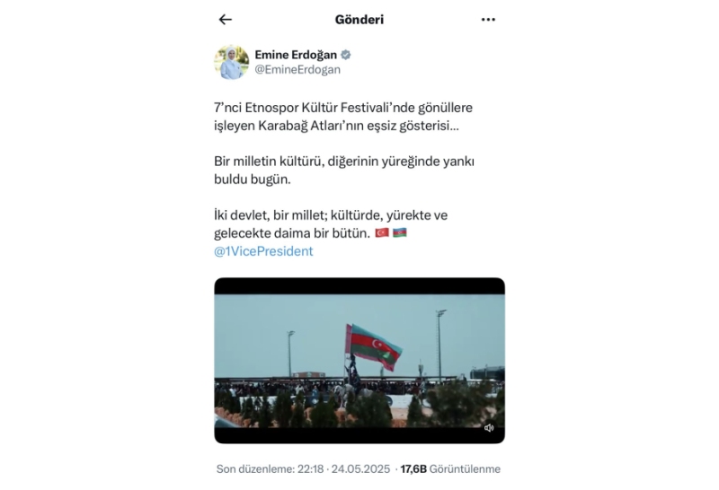 Как сообщает Trend, супруга Президента Турции Эмине ханым Эрдоган поделилась этими высказываниями в аккаунте в социальных медиа после просмотра грандиозной шоу-композиции «Победа», представленной азербайджанской делегацией на VII Международном культурном фестивале по этноспорту.
