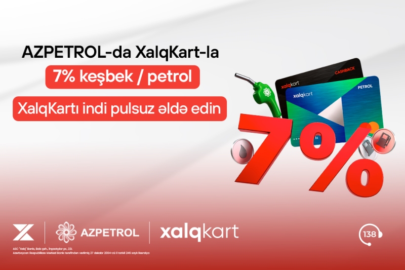 При оплате топлива и услуг на АЗС Azpetrol держатели XalqKart получают повышенный кешбэк или Oil-бонусы в размере 7%. Дополнительный кэшбэк начисляется только при условии оплаты посредством POS-терминалов Халг Банка, установленных на Azpetrol. Кампания действует до 31 декабря 2025 года.
