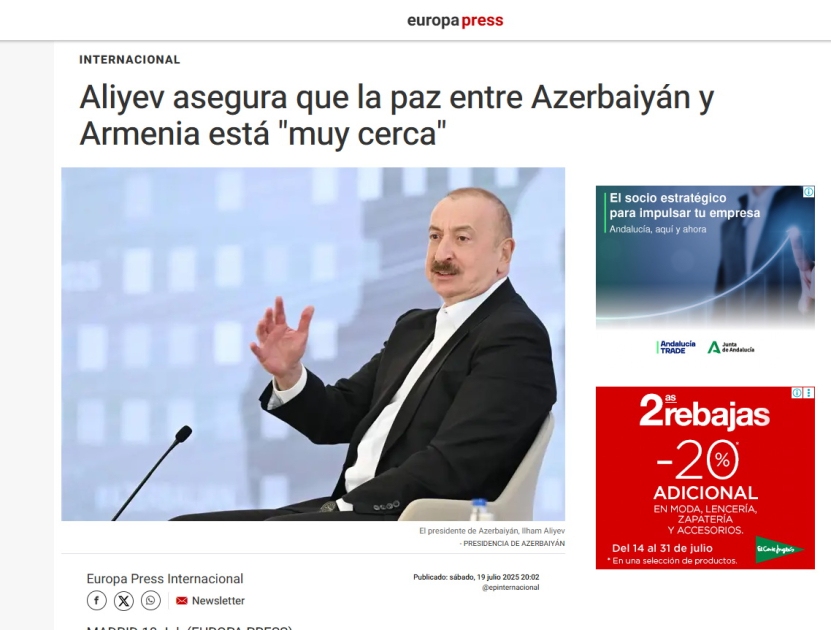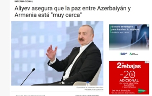 В материалах, опубликованных в популярных испанских медиа Europapress, Democrata, Teleprensa, Upday, большое место было уделено взглядам Президента Ильхама Алиева на подписание мирного соглашения между Азербайджаном и Арменией и открытие Зангезурского коридора. Испанские СМИ отметили, что глава Азербайджанского государства заявил о близости своей страны к миру с Арменией, однако подчеркнул необходимость более конструктивной роли Иревана в этом процессе и одновременного принятия им позитивных мер в направлении открытия коммуникаций.