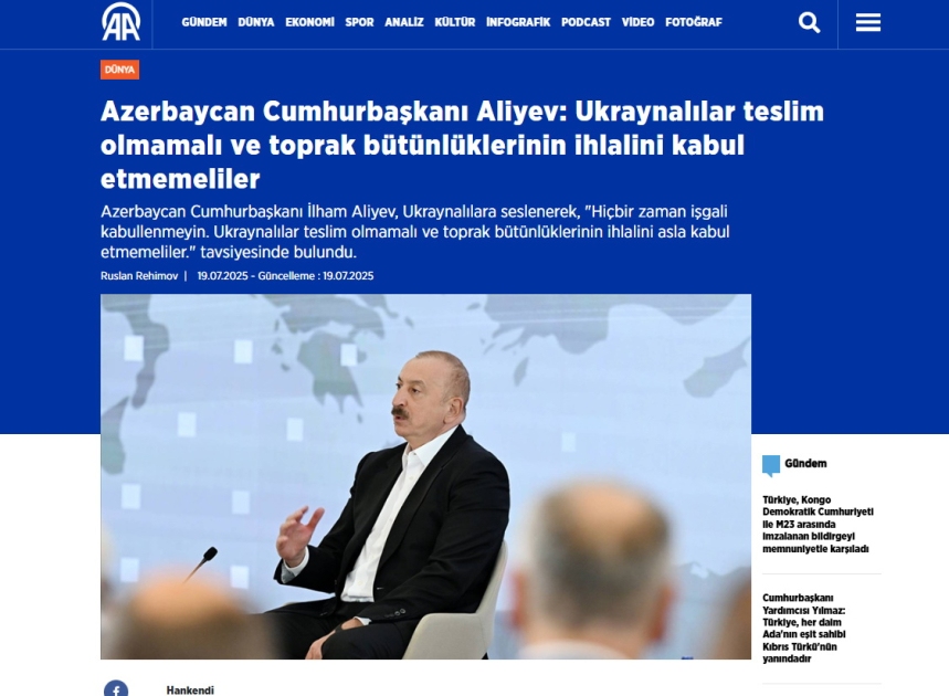 В статьях излагается позиция Президента Ильхама Алиева по армяно-азербайджанскому, российско-украинскому конфликтам и подвергшемуся атакам на территории России самолету «Азербайджан Хава Йоллары» (AZAL). Со ссылкой на главу государства отмечается, что Азербайджан уже семь месяцев не получает от России внятного ответа. Генеральный прокурор Азербайджана направляет запросы в Следственный комитет России, но получает в ответ лишь фразу «следствие ведется». Азербайджан намерен обратиться в международную систему правосудия.