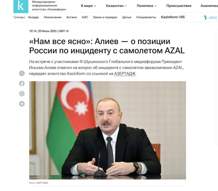 Агентство также передало заявление Президента Азербайджана о подготовке обращения в Международный суд по факту крушения самолета AZAL. Ильхам Алиев подчеркнул, что Баку не получил ответа от российской стороны и требует признания инцидента, привлечения виновных к ответственности и выплаты компенсаций пострадавшим.