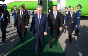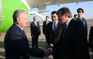 Президента Узбекистана Шавката Мирзиёева в аэропорту встречали министр культуры Азербайджана Адиль Керимли и другие официальные лица.