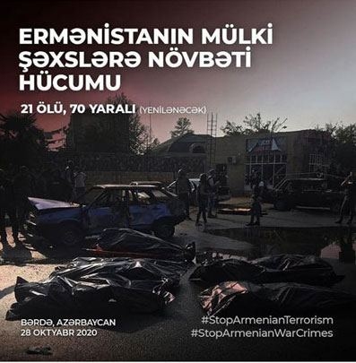 "Сегодня вооруженные силы Армении в очередной раз нанесли бесчеловечный по своей жестокости удар по мирному азербайджанскому городу Барда.