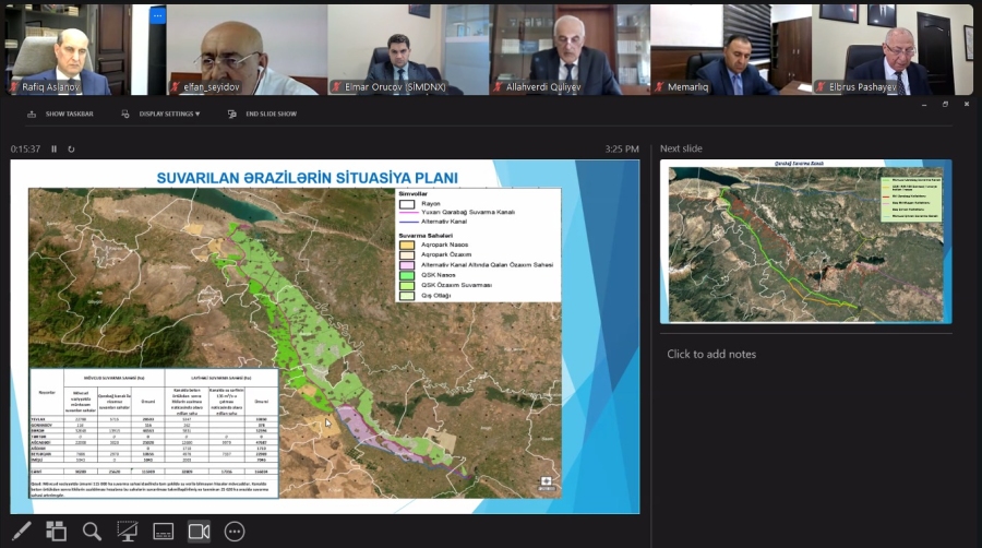 Затем была представлена презентация текущего состояния технико-экономического обоснования и проектной документации по реконструкции Карабахского оросительного канала, подготовленных совместно проектным институтом при ADSEA и специалистами компаний PROYAPI и TEMELSU, участвующих в проекте.