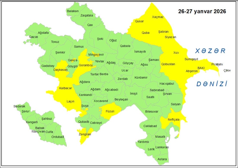 БАКУ/ Trend/ - Национальная гидрометеорологическая служба объявила желтое предупреждение в связи с ветреной погодой, ожидаемой с полудня 26 января до полудня 27-го числа в Баку и на Абшеронском полуострове, а также в большинстве регионов.