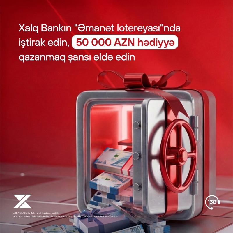 Один из ведущих банков страны - Халг Банк - запускает стимулирующую лотерею «Депозит» для клиентов, размещающих вклады. Согласно условиям лотереи, клиенты, разместившие депозит в период с 1 апреля по 30 декабря 2026 года в филиалах Халг Банка в городах Баку и Сумгаит на сумму не менее 500 AZN/300 USD, а в филиалах в других регионах - не менее 250 AZN/150 USD, получают возможность принять участие в лотерее.