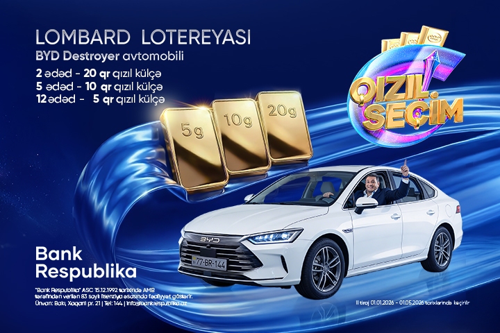 До 1 мая оформите ломбардный кредит в Банк Республика на сумму от 500 манатов и выше на выгодных условиях, станьте участником лотереи «Золотой выбор» и получите шанс выиграть один из ценных призов.