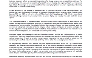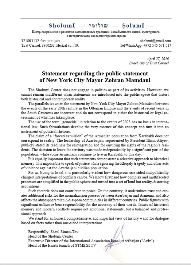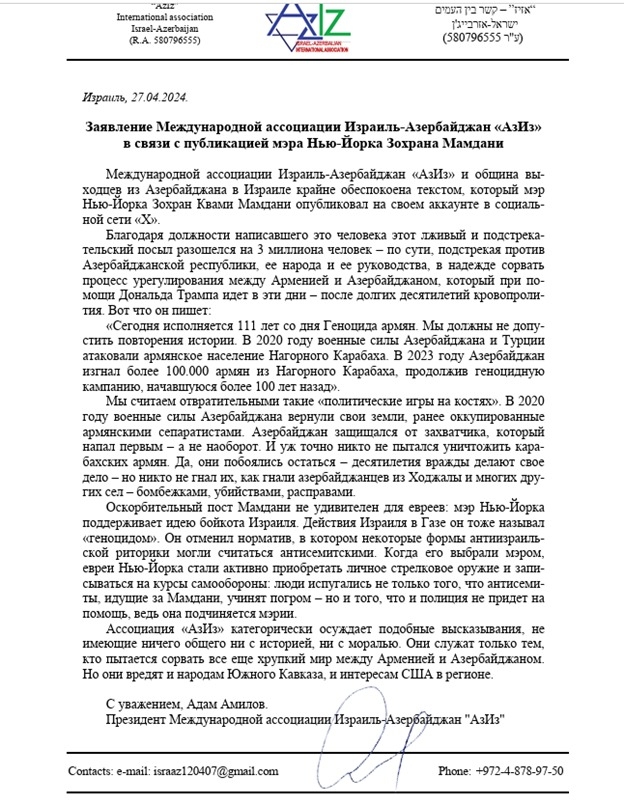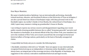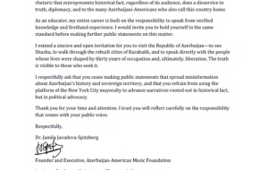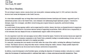 Как сообщает Trend, Азербайджано-американская федерация молодежи, Американский азербайджанский интеграционный центр, Американский азербайджанский музыкальный фонд, Альянс азербайджано-американских организаций, Флоридская азербайджано-американская культурная ассоциация, Культурный центр Азербайджана в Израиле, Международная ассоциация межнациональных связей «Азиз» и Общество азербайджанцев Великобритании, отметив, что данные утверждения противоречат нормам и принципам международного права, направили письмо мэру Нью-Йорка.
