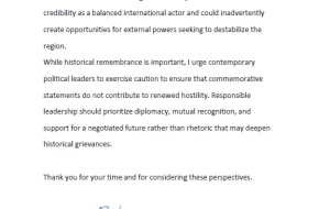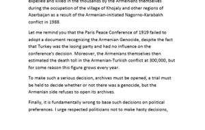 Диаспорские организации требуют занимать объективную позицию по подобным вопросам, основанную на Уставе ООН, резолюциях Совета Безопасности ООН, общих принципах международного права и исторических фактах.