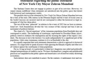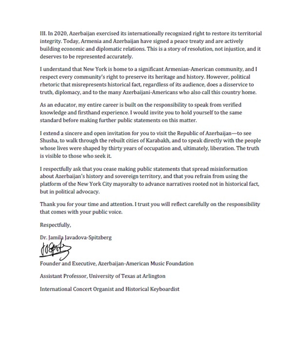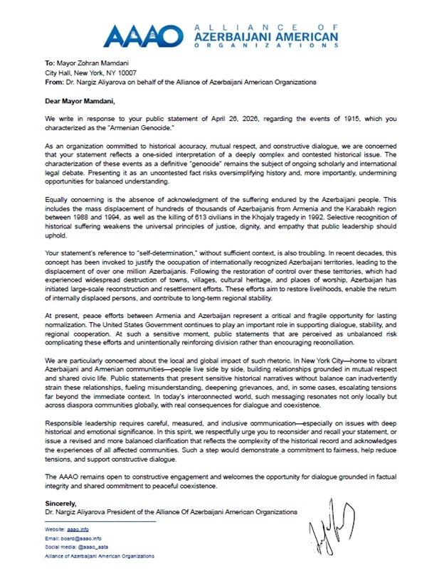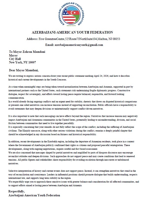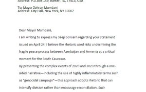 В письмах выражена серьезная обеспокоенность в связи с обвинениями, выдвинутыми мэром Нью-Йорка против азербайджанского народа. Подчеркивается, что в заявлении Зохрана Кваме Мамдани присутствует политическая предвзятость, а также искажены основополагающие принципы международного права. Отмечено, что подобный предвзятый подход недопустим в то время, когда США поддерживают мирное соглашение между Азербайджаном и Арменией и делаются важные шаги по нормализации отношений. Обращено внимание на то, что армянскому населению Карабахского региона в рамках реинтеграции были предложены равные права и гарантии безопасности, а также предпринимаются конкретные шаги для их интеграции в социально-экономическую жизнь. Особо отмечено, что не зафиксировано ни одного факта какого-либо насилия в отношении гражданских лиц по этническому признаку, и в этом направлении действия соответствуют принципам международного права.