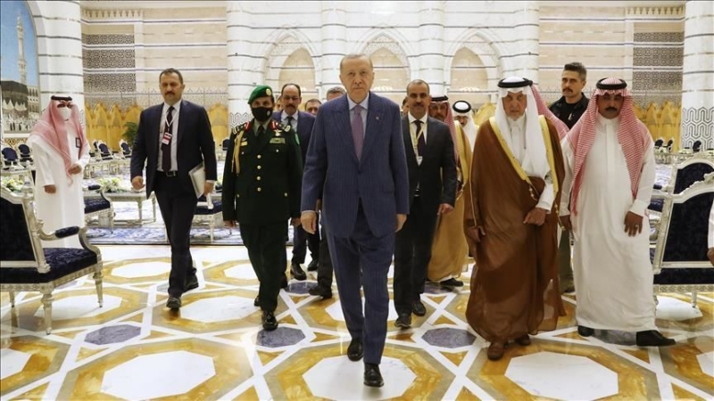 В аэропорту имени короля Абдулазиза в Джидде главу турецкого государства встречали эмир Мекки принц Халид бин Фейсал, посол Турции в Эр-Рияде Фатих Улусой, постоянный представитель Турции при Организации исламского сотрудничества (ОИС) Мехмет Метин Экер и другие официальные лица.