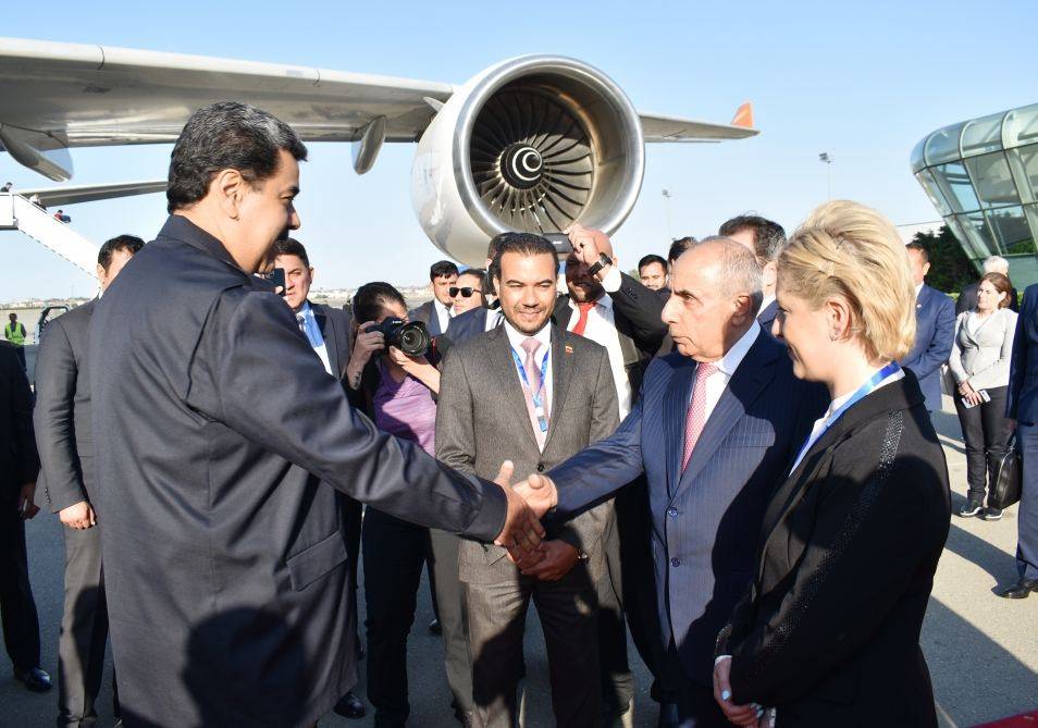 Президента Венесуэлы встречали первый заместитель премьер-министра Азербайджана Ягуб Эйюбов, заместитель министра иностранных дел Эльнур Мамедов и другие официальные лица.