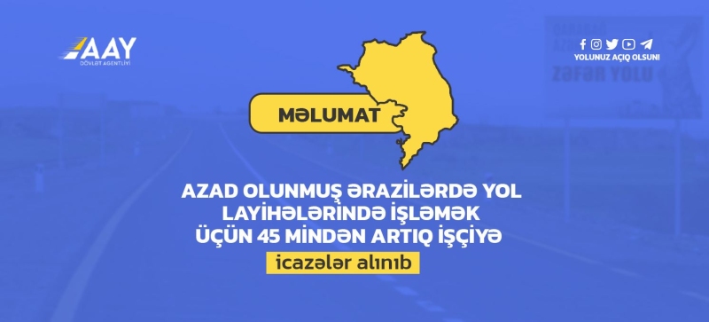 Агентством за прошедший период были получены разрешения на привлечение 38 726 граждан Азербайджана и 6 808 граждан Турции к работе в проектах дорожной инфраструктуры, осуществляемых на освобожденных территориях. Продолжается получение разрешений для новых сотрудников на случай, если возникнет необходимость в дополнительной рабочей силе.