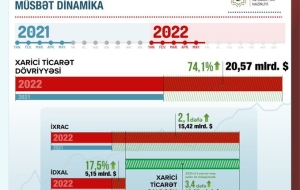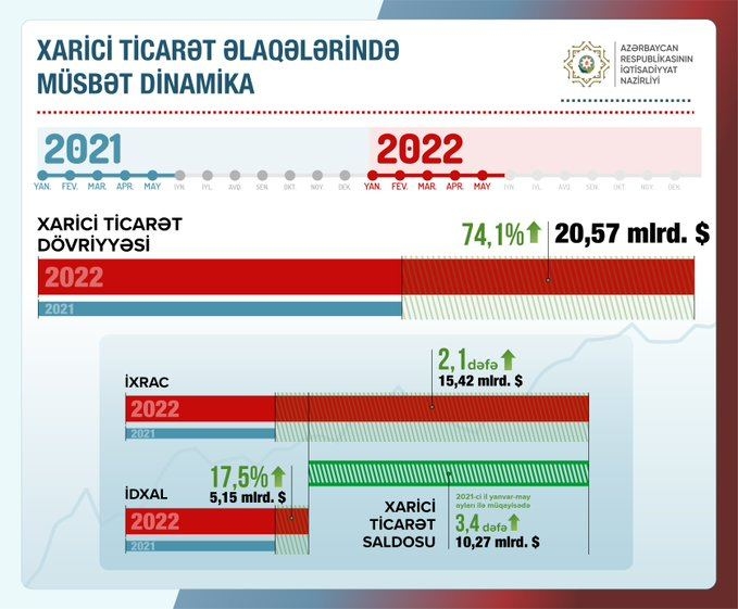 Министр отметил, что азербайджанский экспорт в январе - мае 2022 года вырос в 2,1 раза по сравнению с аналогичным периодом прошлого года и составил 15,42 миллиарда долларов, а импорт - на 17,5 процента – до 5,15 миллиарда долларов.