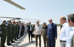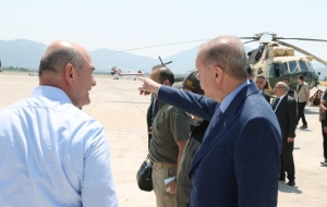 Президент Турции Реджеп Тайип Эрдоган встретился в аэропорту города Даламан с министром внутренних дел Сулейманом Сойлу, министром сельского и лесного хозяйства Вахитом Киришчи и азербайджанскими и турецкими пожарными, которые предоставили главе государства последнюю информацию о продолжающихся лесных пожарах в Мармарисе.