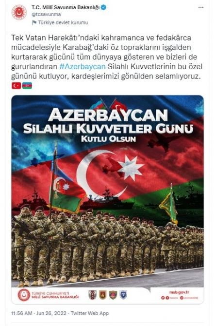 Об этом говорится в поздравлении министерства национальной обороны Турции по случаю 26 июня - Дня Вооруженных сил Азербайджана.