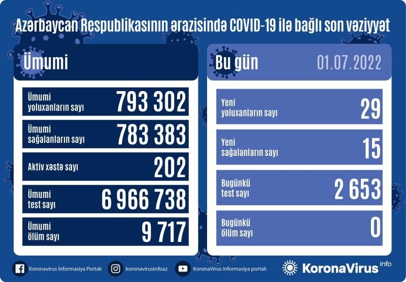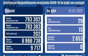 За минувшие сутки коронавирус в Азербайджане выявлен у 29 человек, общее число подтвержденных случаев заражения COVID-19 достигло 793 тыс. 302, сообщает в пятницу республиканский оперативный штаб.