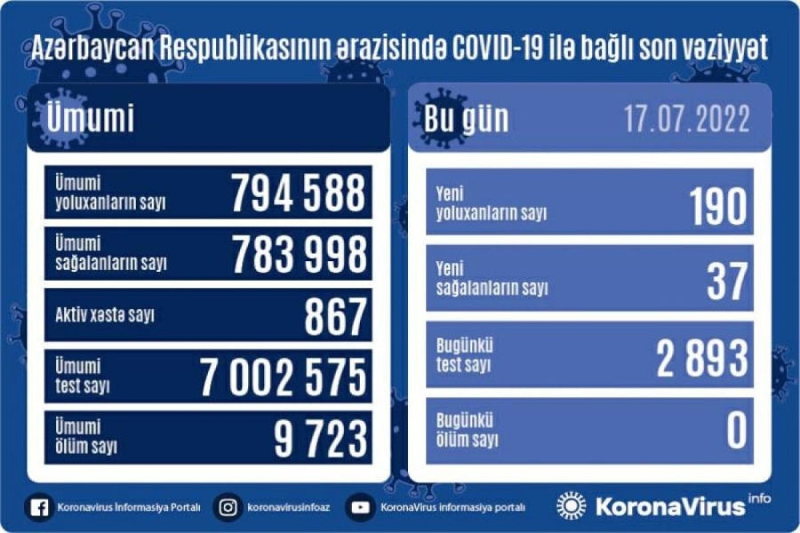 На сегодня в Азербайджане выявлены в целом 794 588 случаев заражения коронавирусной инфекцией, 783 998 человек вылечился, 9 723 – скончались, число активных больных составляет 867.