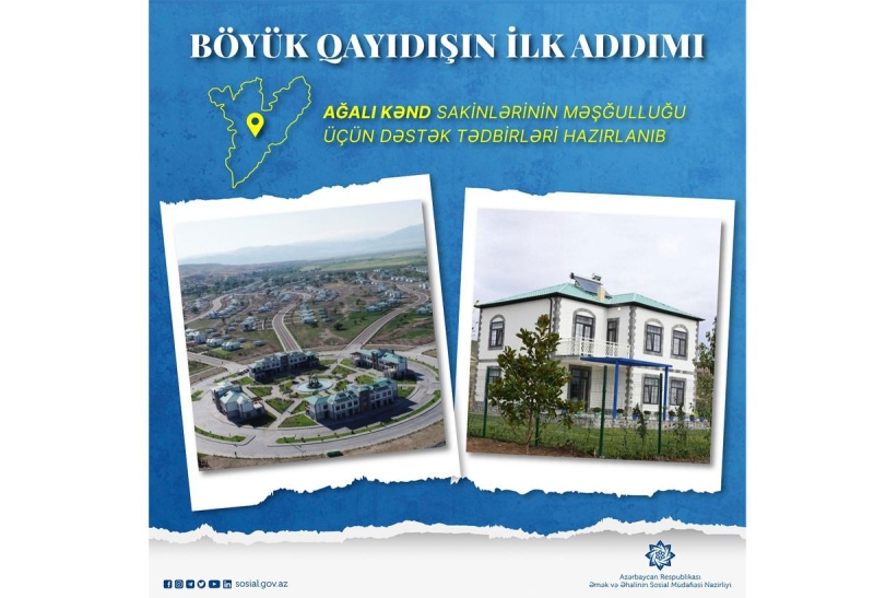 Начались мероприятия по социальному обеспечению и поддержке первых участников Большого возвращения - жителей села Агалы Зангиланского района. Так, Государственное агентство занятости при министерстве труда и социальной защиты населения проводит работу с целью организации самозанятости и обеспечения работой переселяемых жителей.