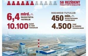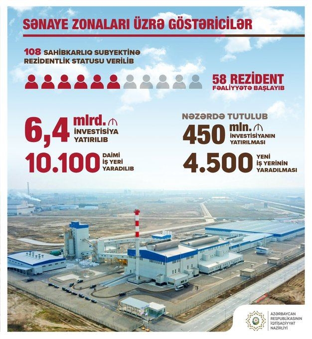 "Предприниматели инвестировали в промышленные зоны более 6,4 миллиарда манатов, создано более 10 100 постоянных рабочих мест. Следующий этап по действующим проектам предусматривает дополнительные инвестиции в промышленные зоны в размере более 450 миллионов манатов и создание более 4 500 новых рабочих мест", - говорится в публикации.