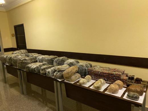 В найденнных на месте преступления свертках было обнаружено 87,7 кг марихуаны, 7,6 кг героина, 400 грамм метамфетамина, а также 1980 таблеток метадона и 12465 таблеток препарата "прегабалин" - в общей сложности 95,7 кг наркотических и психотропных средств.