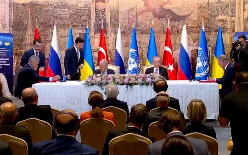Сначала соглашение подписали Турция, Россия и ООН. Затем документ подписали официальные лица Турции, Украины и ООН.