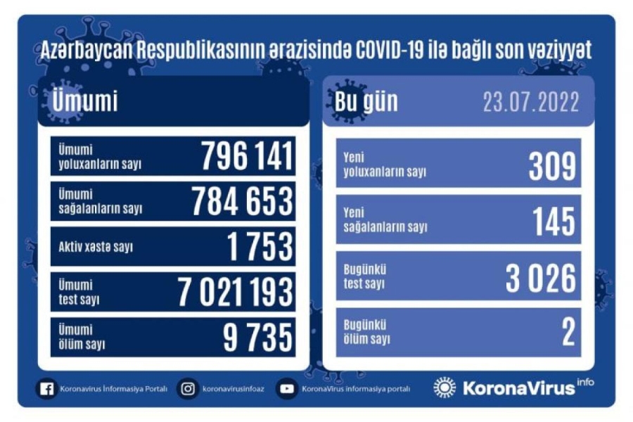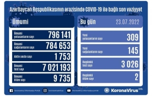 На сегодня в Азербайджане выявлены в целом 796 141 случай заражения коронавирусной инфекцией, 784 653 человека вылечились, 9 735 – скончались, число активных больных составляет 1753.