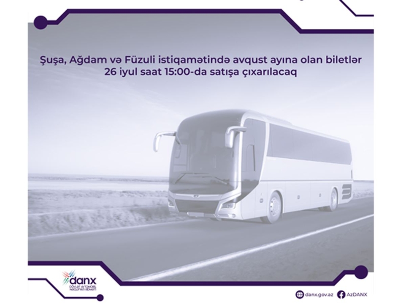 Билеты на август на регулярные автобусные рейсы, организуемые Государственной службой автомобильного транспорта при министерстве цифрового развития и транспорта в города Шуша, Агдам и Физули, поступят в продажу в 15:00 26 июля 2022 года.