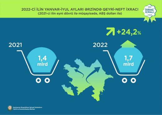 Согласно данным, в июле 2022 года общий объем экспорта из Азербайджана составил $4,1 млрд. Рост экспорта в ненефтяном секторе составил 17,2% - до $224,6 млн. В течение июля 2022 года экспорт продовольственных товаров увеличился на 43,7% - до $61,7 млн, непродовольственных товаров - на 9,5% - до $162,9 млн.
