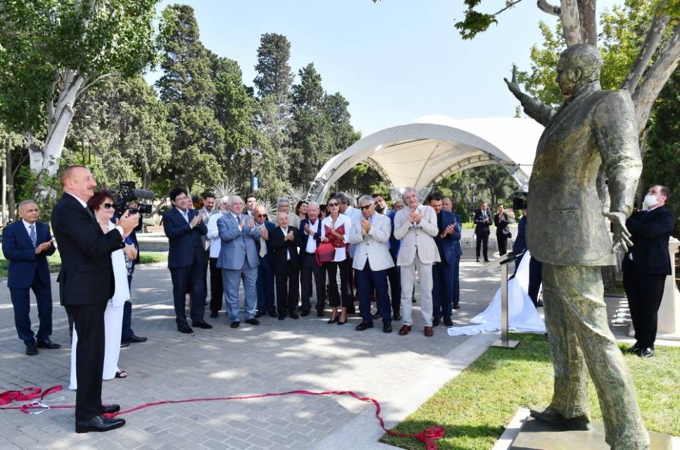 Президент Азербайджана Ильхам Алиев и первая леди Мехрибан Алиева в среду приняли участие в открытии памятника всемирно известному певцу Муслиму Магомаеву на приморском бульваре в Баку.
