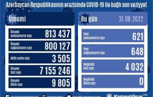 На сегодня в Азербайджане выявлены в целом 813 437 случаев заражения коронавирусной инфекцией, 800 127 человек вылечились, 9 805 – скончались, число активных больных составляет 3 505.