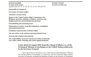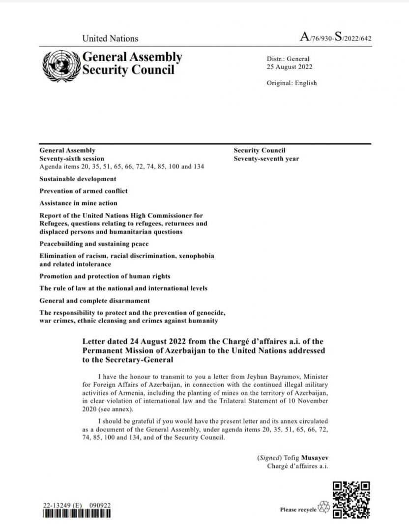 Письмо министра иностранных дел Азербайджана Джейхуна Байрамова о продолжающейся незаконной военной деятельности Армении, включая установку мин на территории Азербайджана, опубликовано в качестве документа Генеральной Ассамблеи ООН и Совета Безопасности ООН.