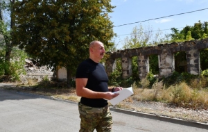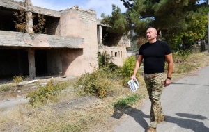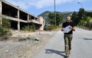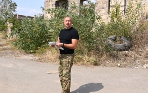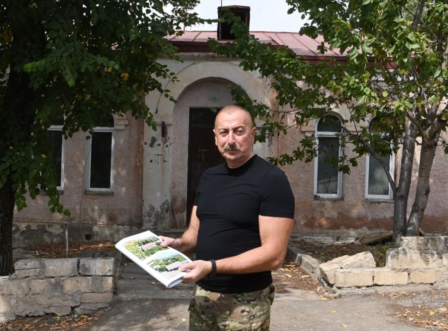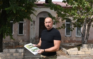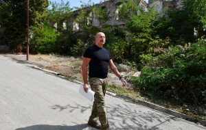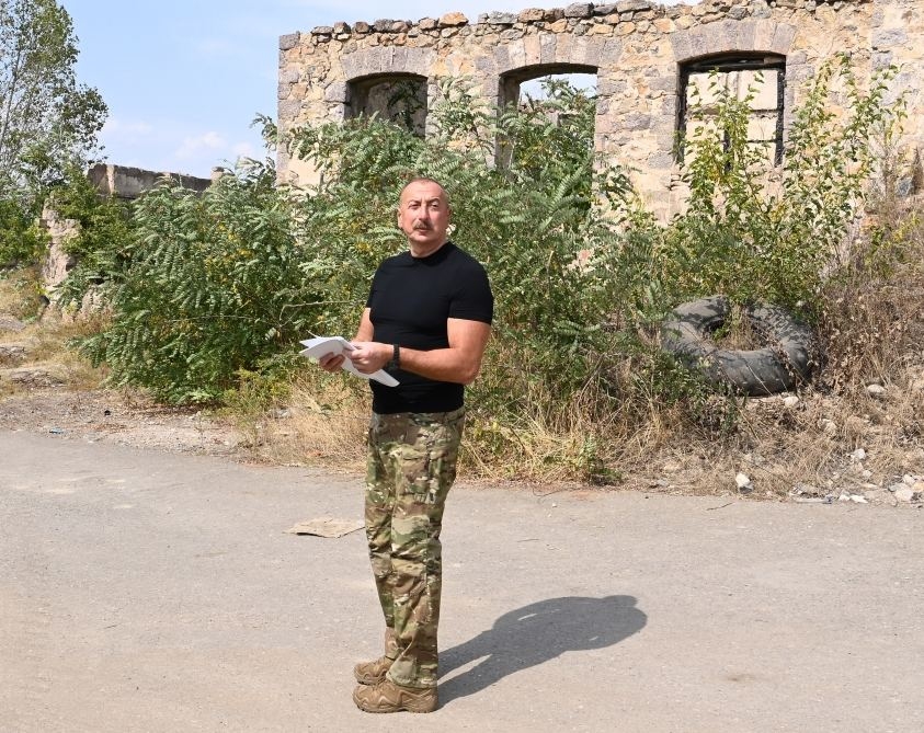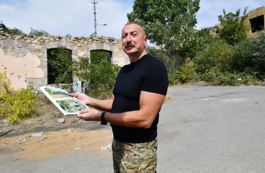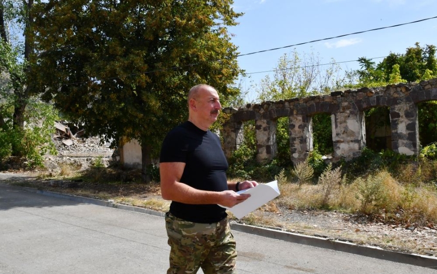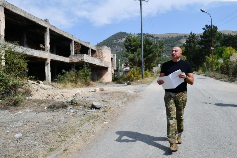 Далее Президент Азербайджана осмотрел разрушения, учиненные армянами на центральной улице города Лачин и территорию города.