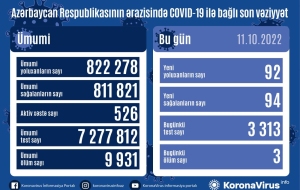 На сегодня в Азербайджане выявлены в целом 822 278 случаев заражения коронавирусной инфекцией, 811 821 человек вылечились, 9 931 скончались, число активных больных составляет 526.
