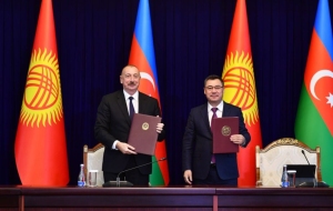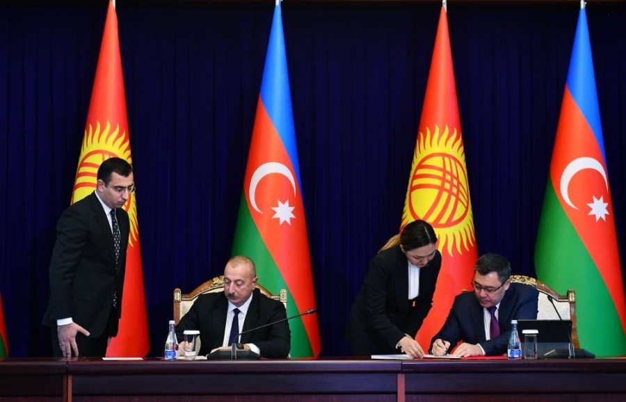 11 октября в Бишкеке после завершения заседания первого Межгосударственного совета между Азербайджаном и Кыргызстаном в расширенном составе состоялась церемония подписания азербайджано-кыргызских документов с участием президента Азербайджана Ильхама Алиева и президента Кыргызстана Садыра Жапарова.