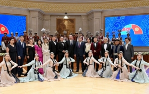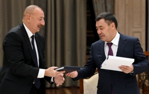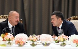 Президент Садыр Жапаров сказал: Уважаемый Ильхам Гейдарович, у нас в стране очень много фанатов Гейдара Алиевича Алиева. Это не пустые слова. Это доказательство - в руках я держу альбом «Память о великом сыне азербайджанского народа Гейдаре Алиевиче Алиеве». Это фанаты сделали альбом и попросили передать его Вам, вручить. С Вашего позволения я вручаю.